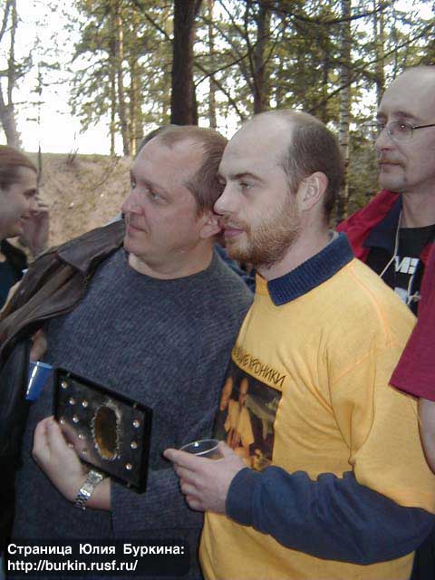Этот снимок сделан Олегом Колесниковым на "Звездном мосту-2001", на соревновании по пейнт-болу. По удивительному стечению обстоятельств именно эта тройка писателей через неделю стала лауреатами "Странника-2001": Буркин за роман, Громов за повесть, Лукьяненко за рассказ.