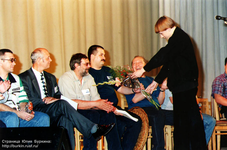 На сцене "Урании" юноша дарит цветы Сергею Лукьяненко. Остальные ехидно хихикают.